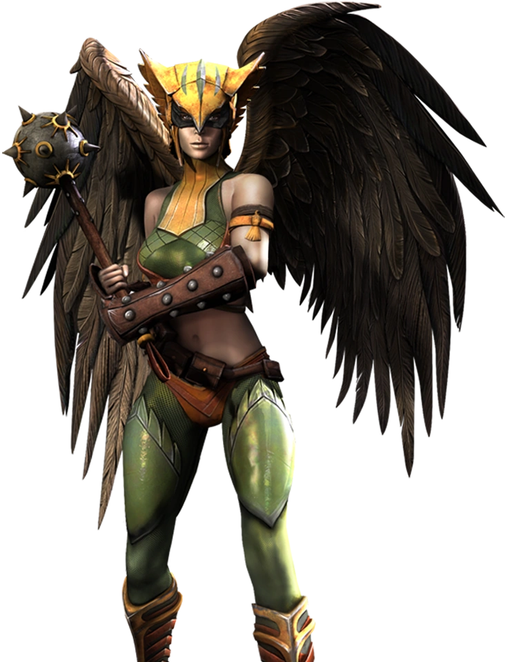 Mulher-Gavião aparece no começo do modo de história com a Liga da Justiça enquanto eles lutam contra vários vilões. Ela ajuda Shazam a derrotar Adão Negro. Mulher-Gavião inicialmente tenta atacar Apocalypse (que saltou no ar) com sua maça.