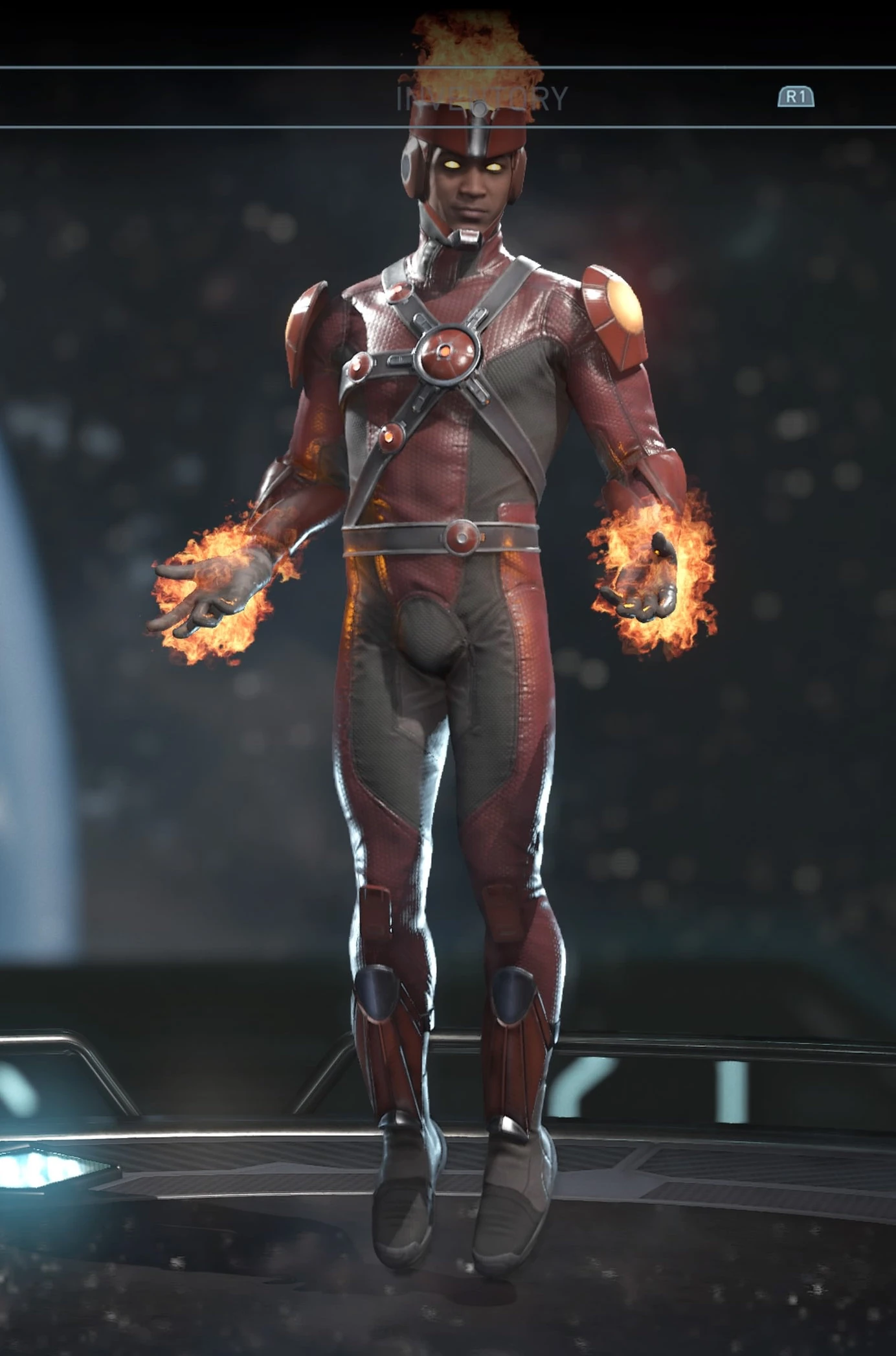 To the right is the base skin for Firestorm, Nuclear Man. He is wearing his default gear. The remainder of his costumes can be found on his gallery page.