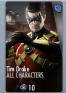 The player starts with three random Bronze characters at the beginning of the game and can get more characters by completing specific battles, buying them from the shop, or earning them as rewards from the Challenge Mode. Every character can level up, and buying more copies of characters allows you to promote them to Elite cards; every "Elite" on the character has bonuses towards Damage and Health. Character cards come in three rarities; Bronze, Silver, and Gold. The higher the rarity, the better base stats come with the character. Each character has a "Passive Ability," which grants them a boost in gameplay for themselves or for the whole of the team. (For example, Superman Regime gains 50% more damage for 6 seconds at 40% health). They also have two Special Attacks, which are unlocked at Levels 1 and 5, respectively. The higher the Special Attack, the more powerful it is. The first two Special Attacks can deal Special Effects such as Poison, Power Drain, Bleeding, Frozen, or Stun the opponent. The level 20 attack is a Super Move which is a High-Damaging UNBLOCKABLE Attack.